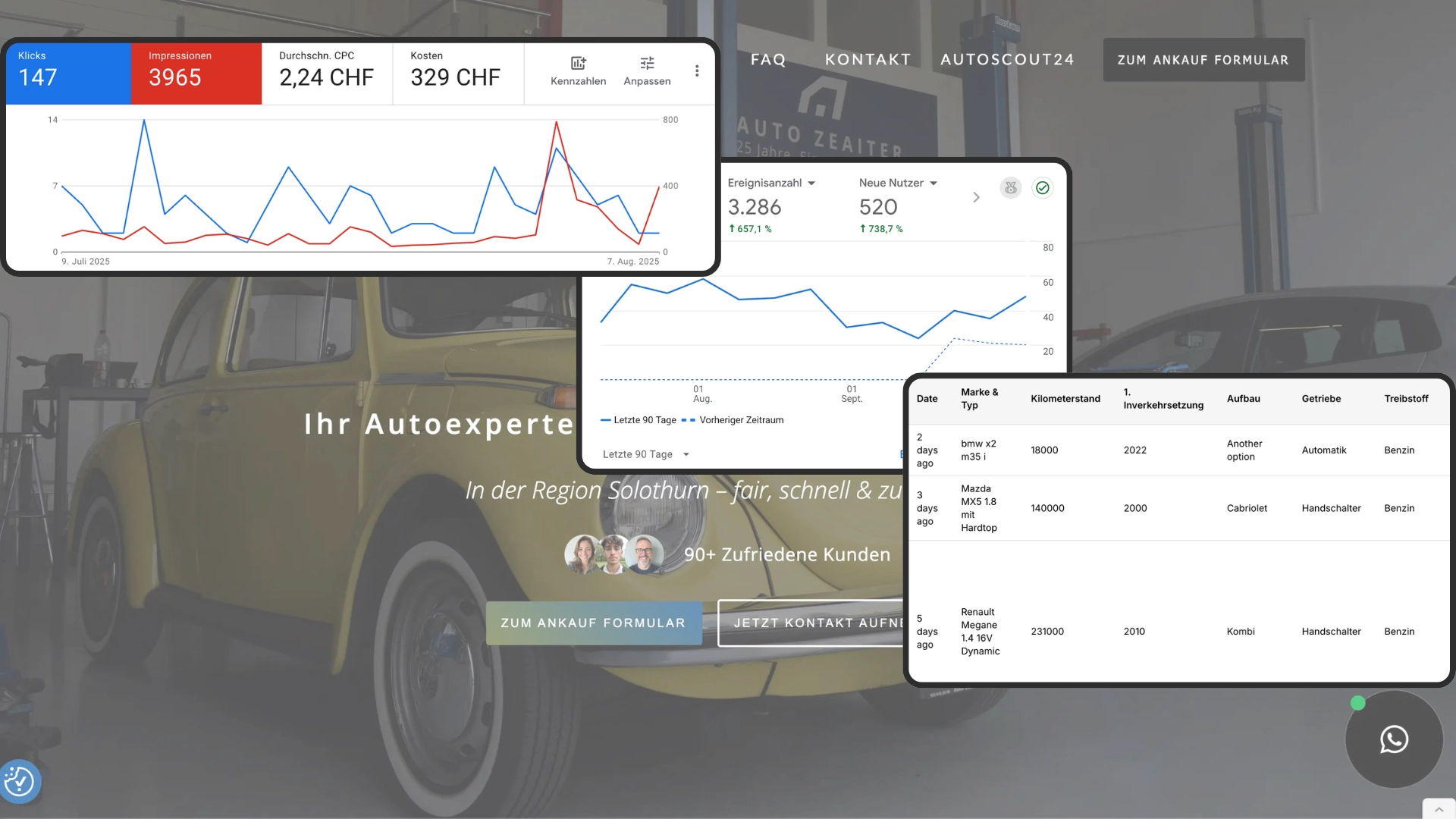 Der grösste Hebel lag jedoch in der gezielten Leadgenerierung über Google Ads. Durch eine Mischung aus hoch-, mittel- und niedrig-umkämpften Keywords entstand eine Kampagne, die bereits mit einem kleinen Tagesbudget starke Resultate lieferte. Jede Anzeige leitete Nutzer direkt auf das Autoankauf-Formular – ohne Umwege, ohne Streuverlust.